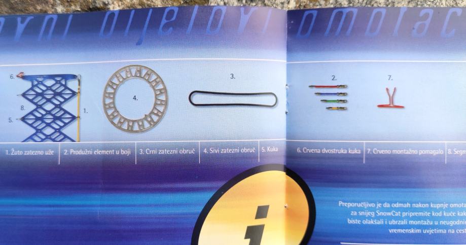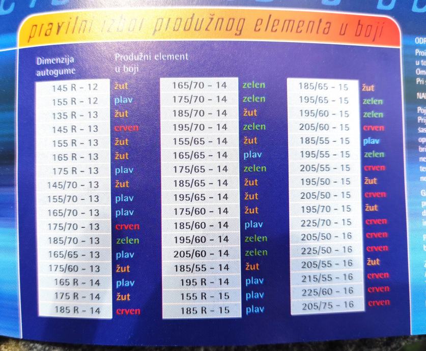 Dimenzije guma koje pokrivaju su u rasponu od 145R-12 do 205/75-16, sve one koje su označene CRVENO ili ŽUTO ( tablica na slici ), a za što služe produžni elementi za montažu. U kompletu su 2 crvena produžetka i 2 žuta.