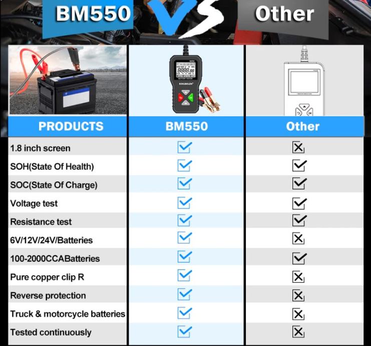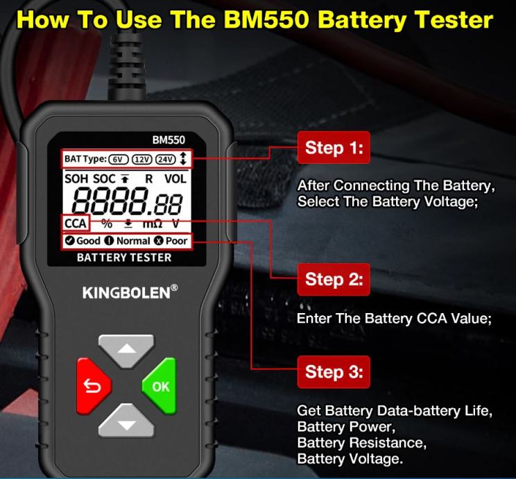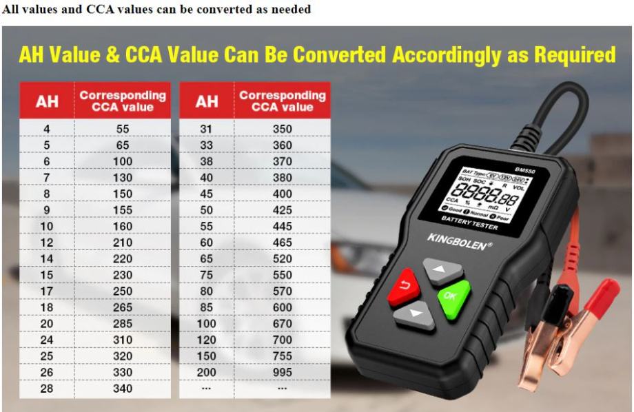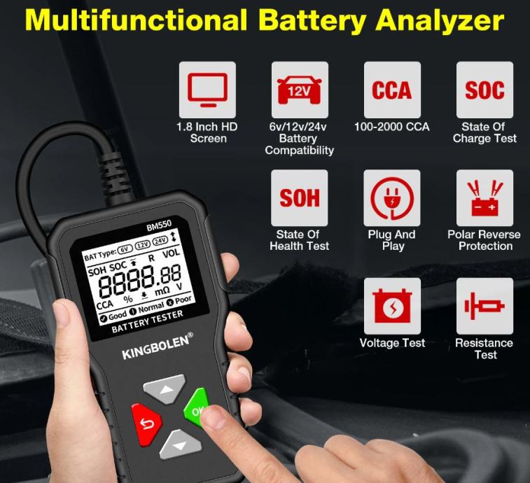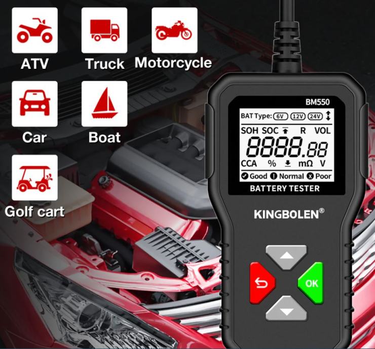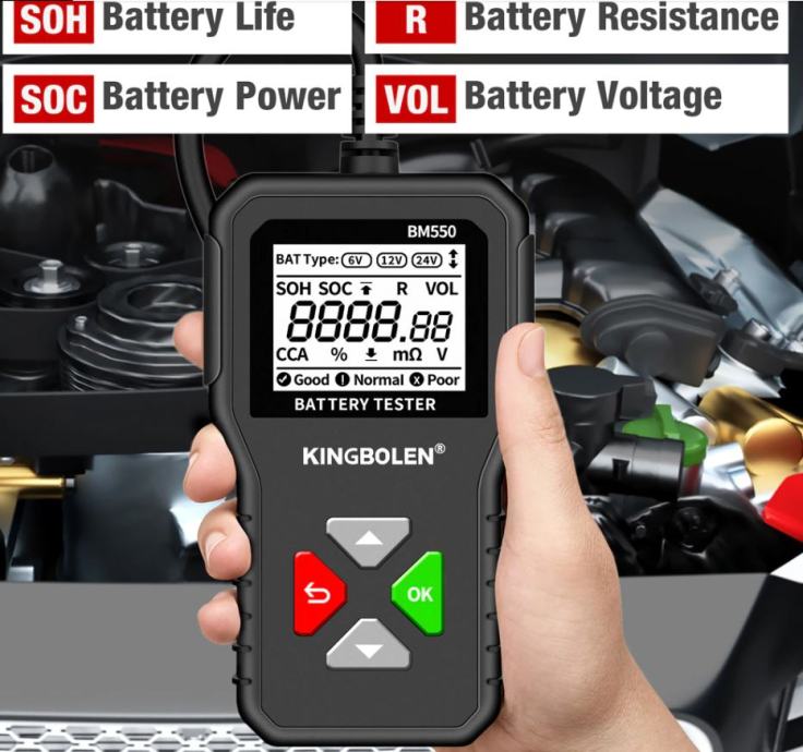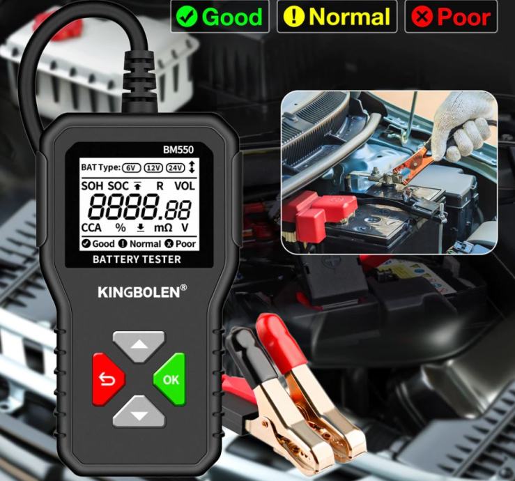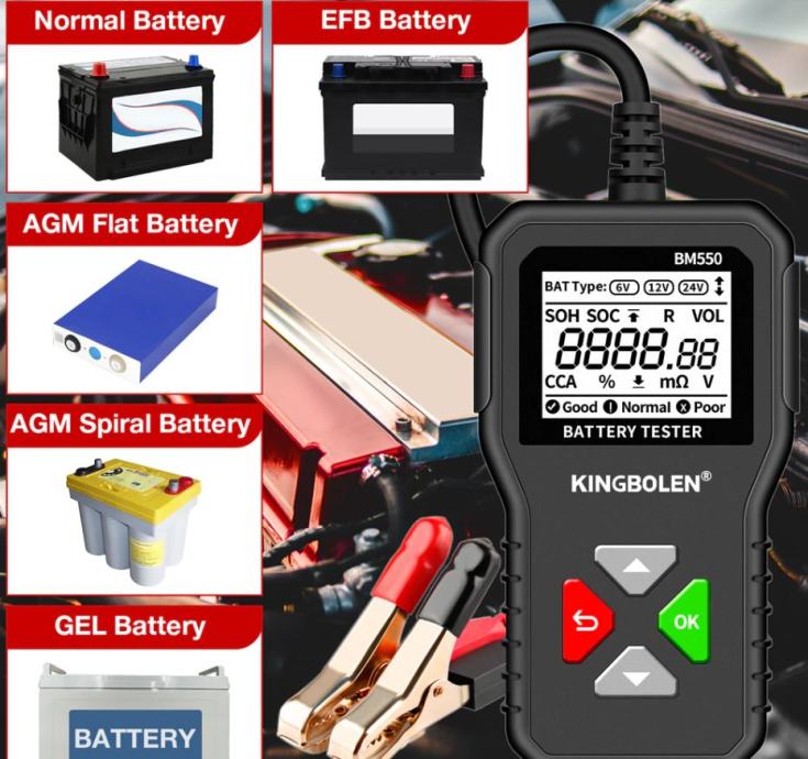 BM550 24V/12V/6V tester akumulatora za automobile može učinkovito analizira i očita važne podatke o automobilu kao što su napon, unutarnji otpor, pojačivač hladnog pokretanja i kapacitet AH, zdravlje baterije i status napunjenosti. Pruža točne rezultate, izračunava sposobnost hladnog pokretanja baterije i stupanj starenja, što omogućuje brži i precizniji popravak automobila.