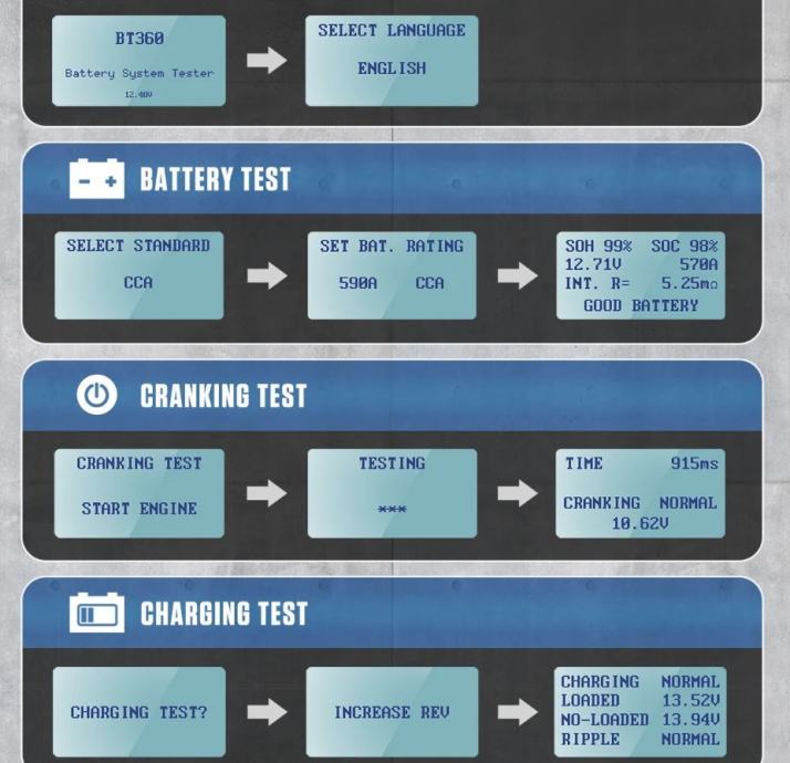 Pruža brzo, i jednostavno rješenje za bolje upoznavanje statusa punjenja baterije, provjeru zdravlja baterije i otkrivanje kvarova.