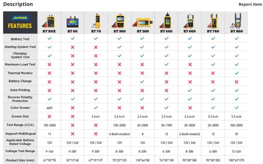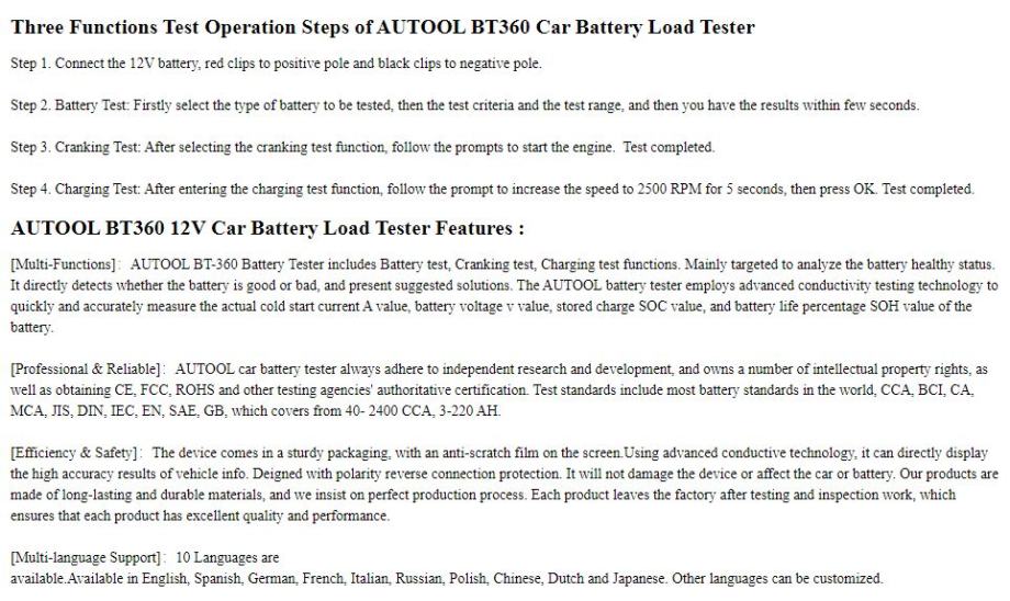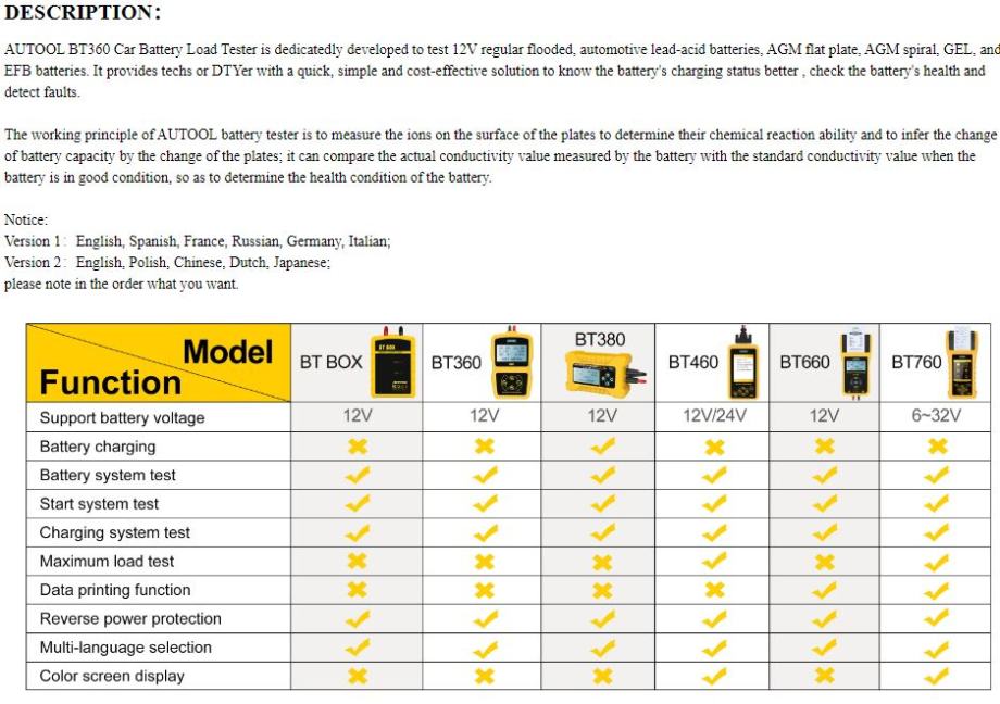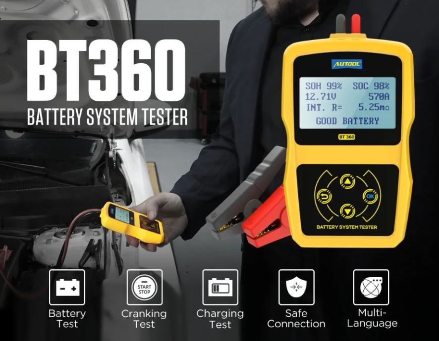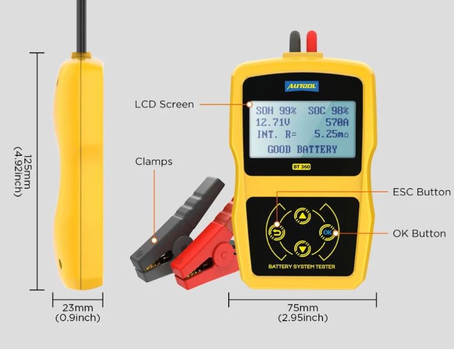 BT360 12V tester akumulatora za automobile može učinkovito analizira i očita važne podatke o automobilu kao što su napon, unutarnji otpor, pojačivač hladnog pokretanja i kapacitet AH, zdravlje baterije i status napunjenosti. Pruža točne rezultate, izračunava sposobnost hladnog pokretanja baterije i stupanj starenja, što omogućuje brži i precizniji popravak automobila.