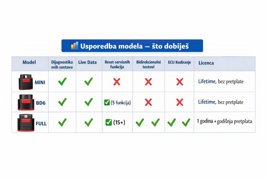 THINKDIAG FULL (120€) – Najjači model s naprednim mogućnostima koji uključuje sve od MINI i BD6, plus ~15 servisnih reset funkcija kao DPF regeneraciju, SAS reset, baterijski BMS reset, bidirekcionalne testove aktuatora i ECU kodiranje / napredne prilagodbe. Nakon besplatne prve godine nadogradnji, zahtijeva se godišnja licenca koja se plaća putem aplikacije.