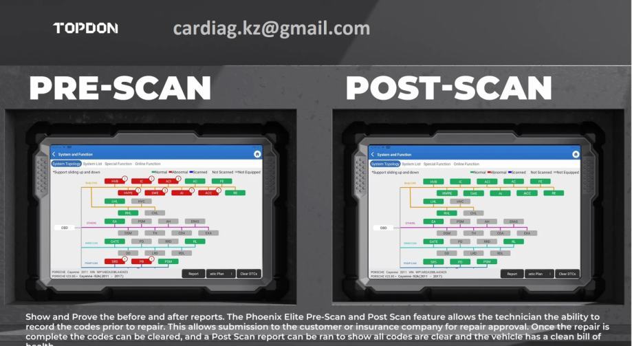 Pokažite i dokažite izvješća prije i poslije. Značajka Phoenix Elite prije skeniranja i nakon skeniranja omogućuje tehničaru da snimi kodove prije popravka. To omogućuje podnošenje kupcu ili osiguravajućem društvu na odobrenje popravka. Nakon što je popravak dovršen, kodovi se mogu izbrisati, a može se pokrenuti i izvješće nakon skeniranja kako bi se pokazalo da su svi kodovi čisti.