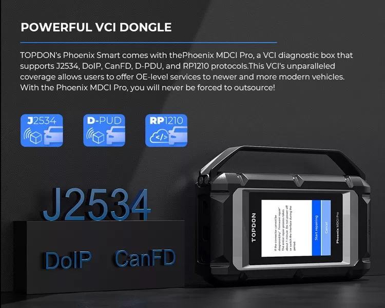 TOPDON Phoenix Smart dolazi sa Smart MDCI, VCI dijagnostičkom kutijom koja podržava J2534, DoIP, CanFD, D-PDU i RP1210 protokole.