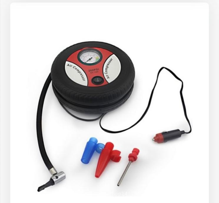 višenamjenski zračni kompresor za napuhavanje guma, lopti i dr. Dolazi s tri različita priključka i manometrom. Da biste napuhali automobilsku gumu, uključite kompresor u utičnicu upaljača za cigarete. Auto bi trebao raditi dok se koristi kompresor. Kompresor će sam prestati raditi kada se postigne potreban tlak. Nemojte ga koristiti duže od 10 minuta bez prekida. Nakon 10 minuta rada, napravite pauzu i nastavite koristiti. Nemojte koristiti ako je kabel oštećen. Držite ga izvan dohvata djece i kućnih ljubimaca.