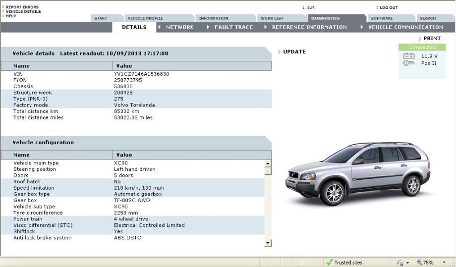 Dijagnostika podržava Volvo vozila od 1999. godine pa nadalje te sadrži identifikaciju kontrolera,