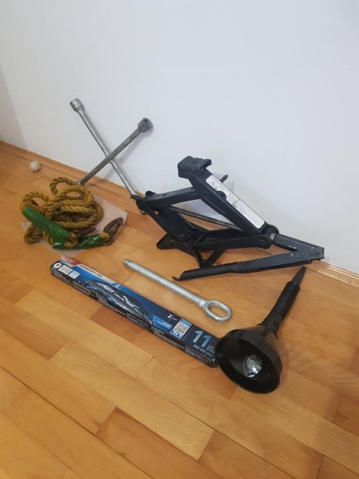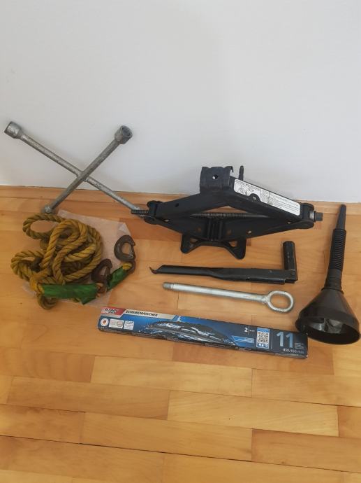 Prodajem za VW TRANSPORTER / BUS T5 auto dizalicu, ručku za šlepanje, četverokrakni ključ, uže za vuču i lijevak i set brisača 45.