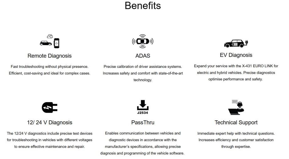 Professional Launch X-431 Euro Link je najnoviji model iz serije X-431 s naprednom funkcionalnošću i mnogim opcijama. Glavni tablet-PC baziran je na Android OS-u, ima 2.0GHz četverojezgreni CPU, 4 GB RAM-a, 128 GB prostora za pohranu, punjivu polimer litij bateriju od 47.88Wh (7.6V, 6300mAh), zaslon od 10.1" i vrlo zaštićen dizajn (IP65) s praktičnim stražnjim postoljem. Dijagnostičko sučelje ima inteligentnu funkciju dijagnostike s novom (IDA) inteligentnom dijagnostičkom pomoći, automatsku identifikaciju vozila i potpuno skeniranje sustava, dijagnostičku povijest za pohranu podataka o vozilu, brzi pristup (23) servisnim funkcijama, informacije o popravku i ugrađenu profesionalnu bazu podataka (baziranu na HaynesPRO-u), daljinsku dijagnostiku pomoću druge X-431 opreme i Super Remote Diagnosis pokretanu SmartLink platformom, funkciju dijagnostičke povratne informacije, odjeljak s alatima s dostupnom dodatnom opremom, pregled pokrivenosti vozila i drugo. ADAS za kalibraciju radara i senzora ADAS sustava. Euro Link dolazi s novim bežičnim dijagnostičkim VCI Smartlinkom s DoIP-om, CAN-FD-om i J2534 Pass-thru-om (dijagnostički softver OE razine) koji podržava sve profesionalne funkcije, uključujući testiranje i aktivaciju komponenti, kodiranje, prilagodbu, online programiranje. i treperi.