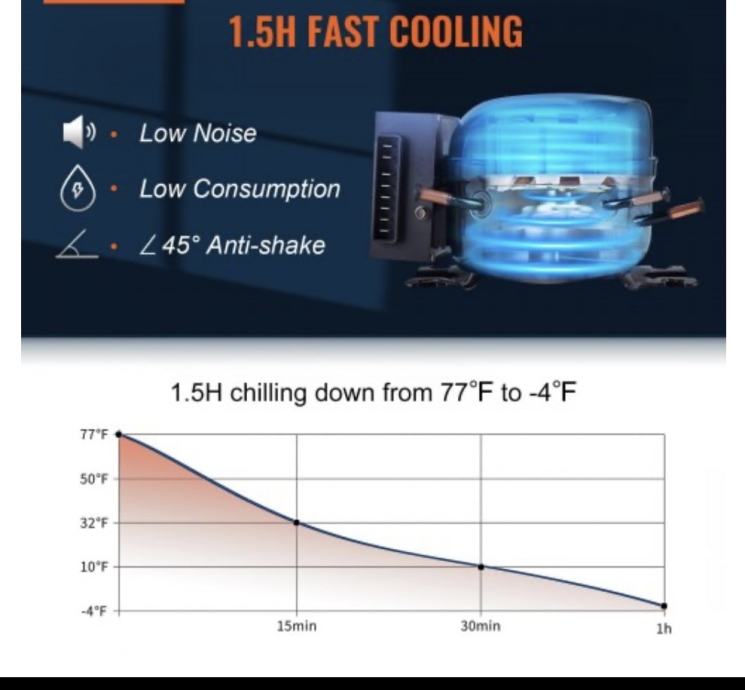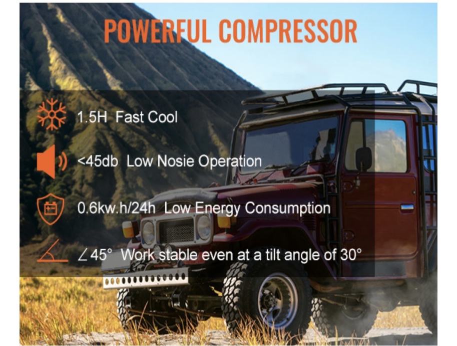 Doživite brzo i učinkovito hlađenje s našim mini auto hladnjakom. Opremljen poboljšanim kompresorom, hladi sa 77 na -4℉ (25~-20°C) u samo 1,5 sat, održavajući vaša pića i hranu osvježavajuće hladnima. Čak i pod kutom nagiba od 45°, radi savršeno, što ga čini savršenim suputnikom za avanture na otvorenom ili rad u pokretu.