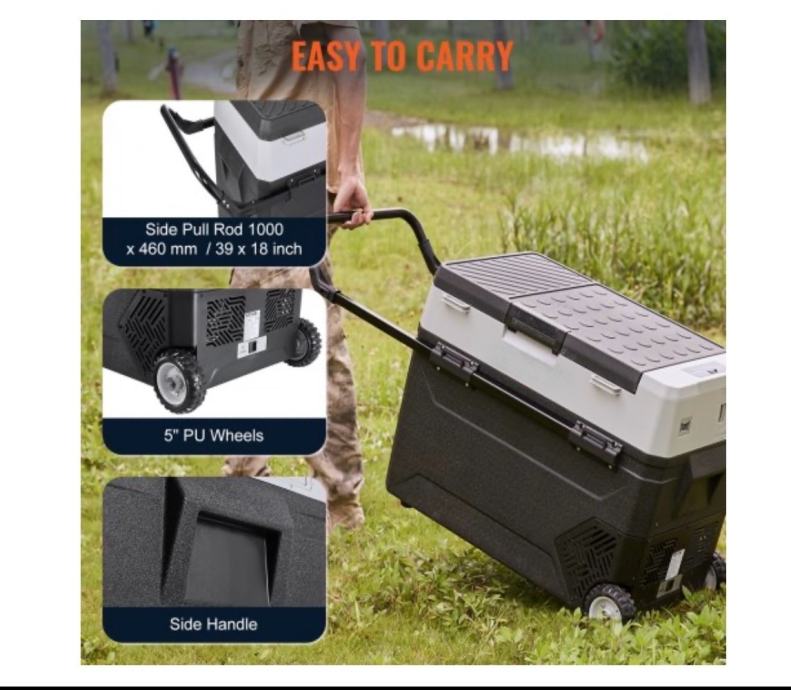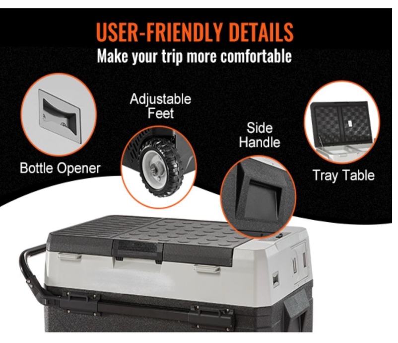 Ovaj auto hladnjak je dizajniran za praktičnost. Sadrži kotače koji se glatko kotrljaju i praktične ručke za laku mobilnost. LED rasvjeta iznutra osigurava dobar pregled. Uz to ima priključak za punjenje telefona i digitalni prikaz temperature. Svoja pića možete sigurno pohraniti u držač za čaše.