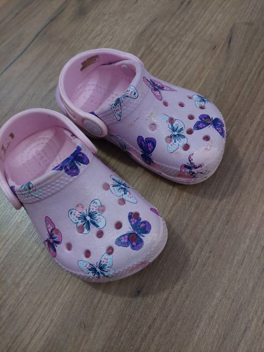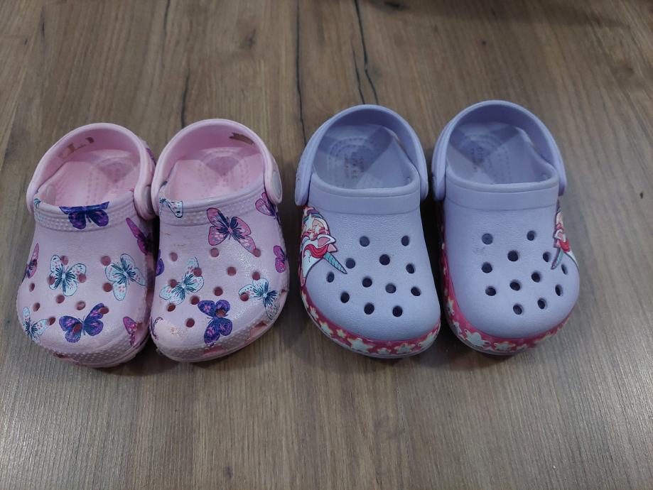Prodajem Crocs papuce za djevojčice. Roze s leptirima su u veličini 5 što odgovara 20/21, a ljubicaste s jednorogom u veličini 6 što odgovara 22/23.