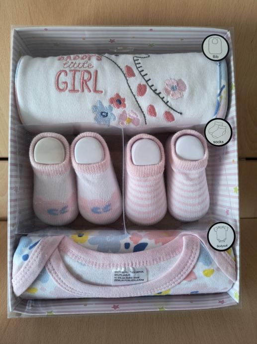 Komplet se satoji od bodyća, partleka i 2 para čarapica, novo, 0-6 mj. može za poklon.