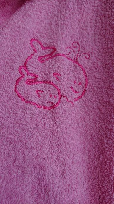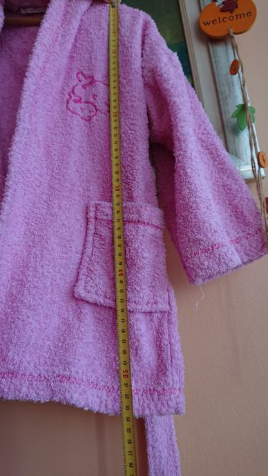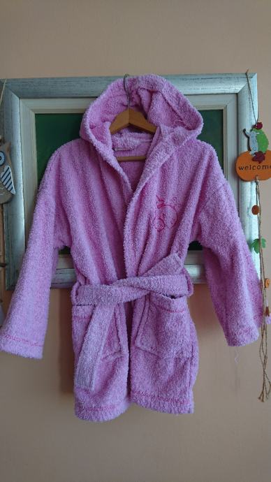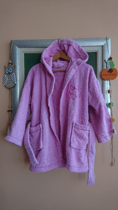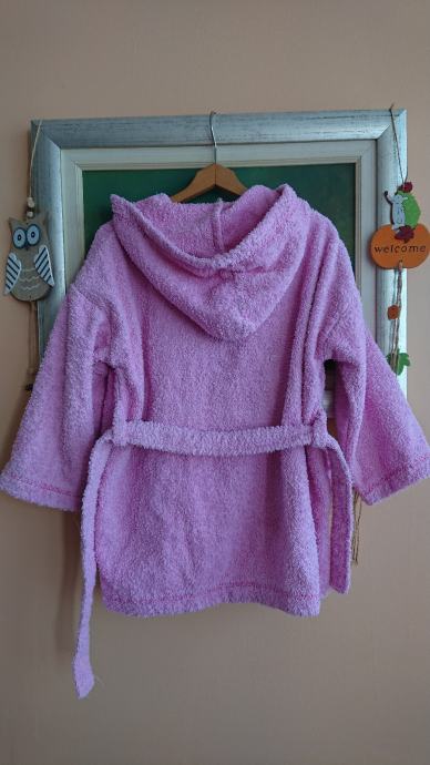 Bademantil / šlafrok / ogrtač za curice br. 98, nosiv i duže, dužina cca 53cm, pretežno roze boje, pamučan, udoban, sa kapuljačom, sa likovima kitova naprijed, sa dva džepa i pojasom za vezanje, nošen, stanje vidljivo na slikama.