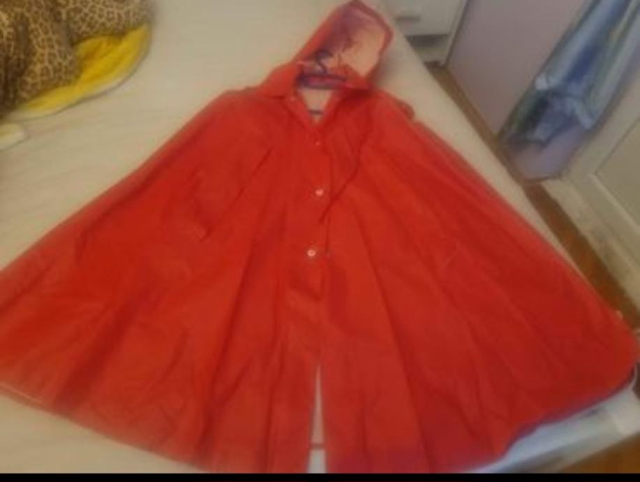 Prodajem kišnu kabanicu zgodna jer se moze i torba ispod nositi.Ima proreze kroz koje idu ruke i platno iznutra .Bez oštećenja ili tragova nošenja.