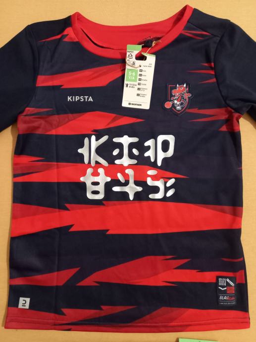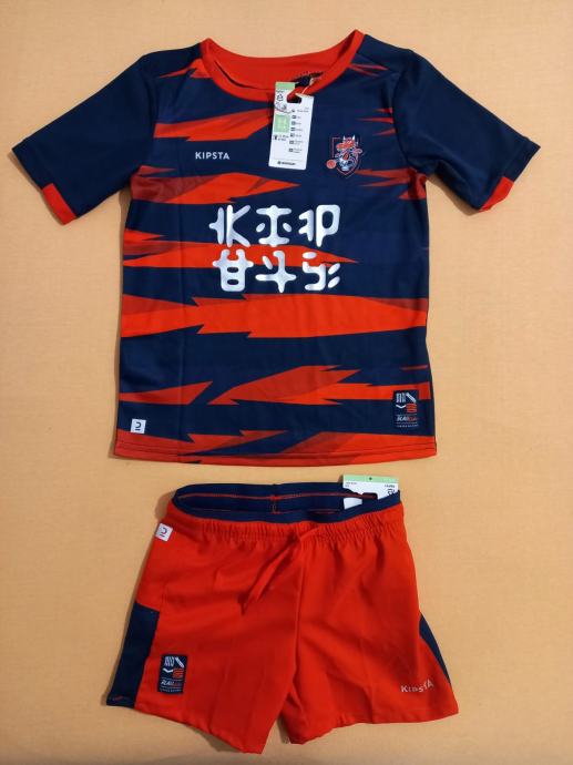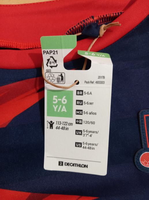 Prodajem dječji dres za trening za nogomet, komplet majica + hlačice iz Decathlona. Ima još etiketu, kupljeno u Italiji, ali nažalost djetetu premaleno. Cijena u Decathlonu je 20eur za oboje, a ja prodajem komplet za 9eur. Veličina je 5-6god (112-122cm)