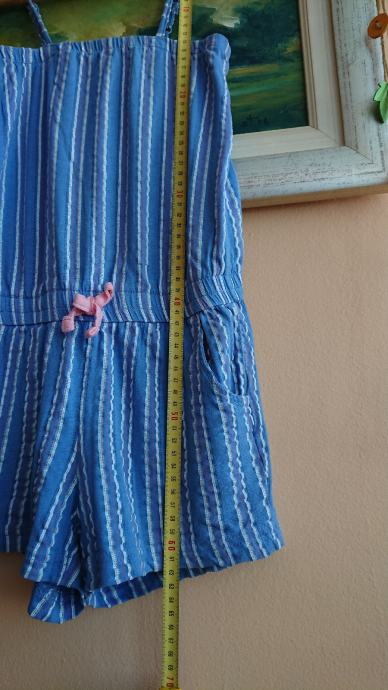 1. Plavi vel. 122, dužina 61-62cm, sa rozom mašnicom i dva džepa naprijed - 5 EUR;