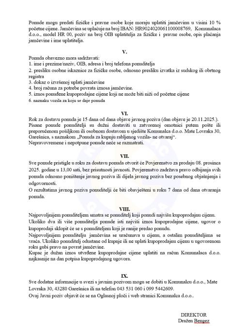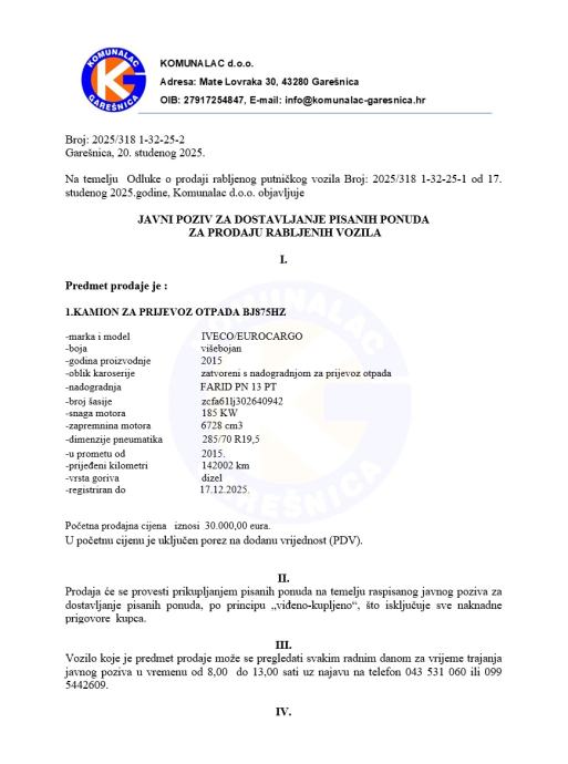 Javni poziv za dostavljanje pisanih ponuda za prodaju rabljenog komunalnog vozila - kamion smećar