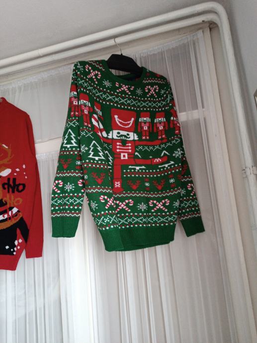Prodajem muški džemper veličine XL s prazničnim božićnim motivima u zelenoj i crvenoj boji. Potpuno nov, bez etikete, idealan za nadolazeće blagdane. Uzorak uključuje tradicionalne zimske i božićne motive poput jelkica i pahuljica.