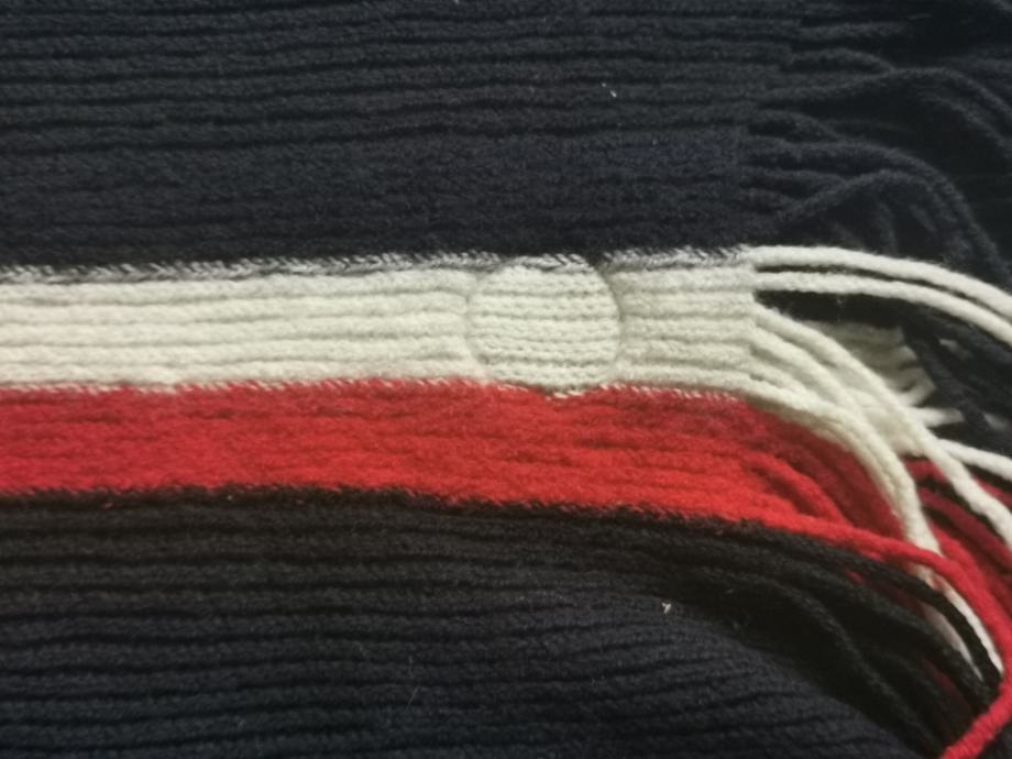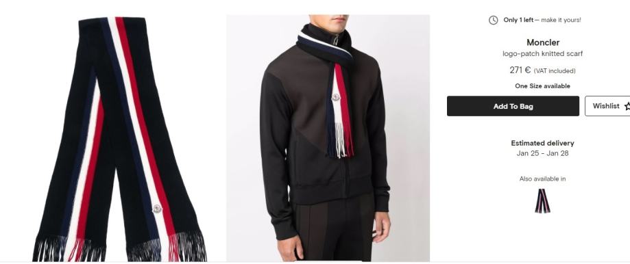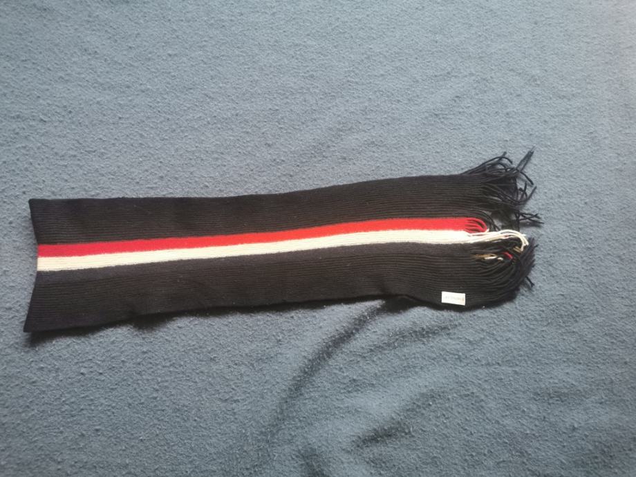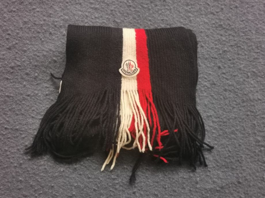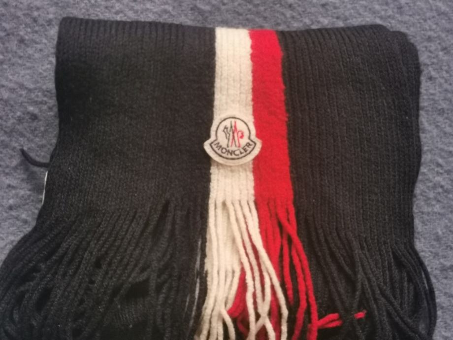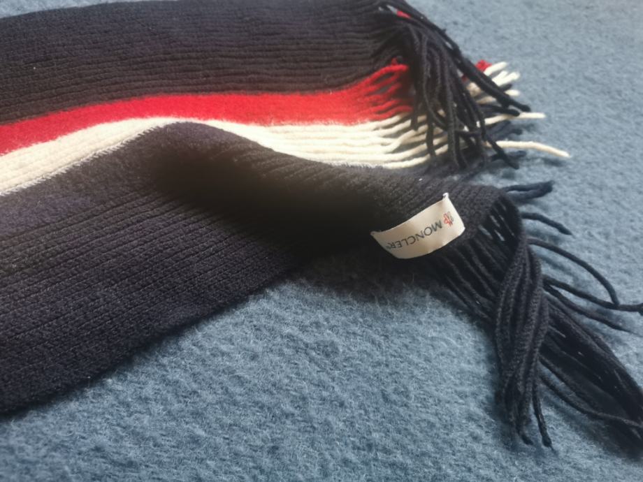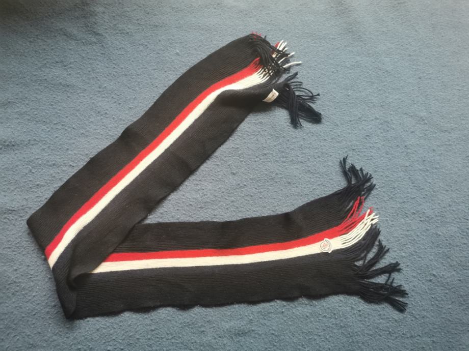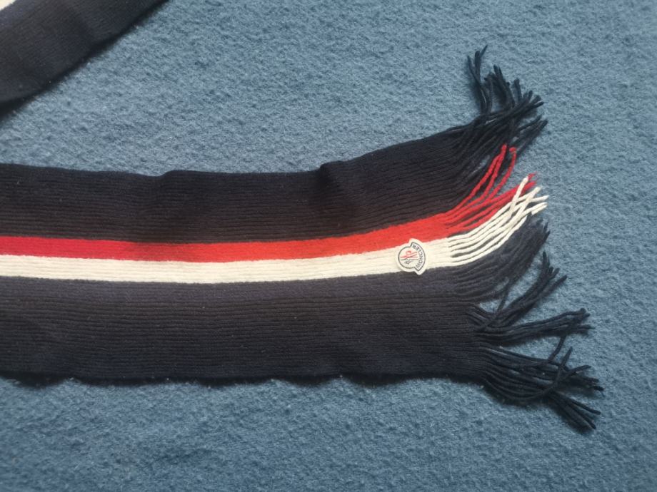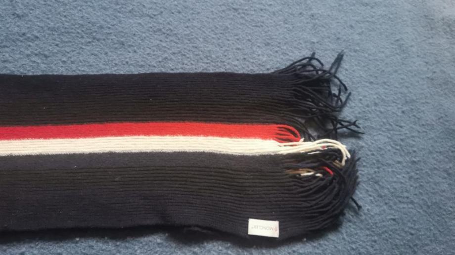 Moncler muški šal za uškarce iako može biti i unisex jer se radi o šalu. Izrađen je od čiste vune sa trodjeli uetko u sredini ali je crne boje tako da sadrži crnu, plava, bijelu i crvenu boju na sebi. Pletivo je rebrasto, ia obrubljene rubove sadrži prepoznatljivi moncler logo. U odlično stanju je šal. Moguće ga je vidjeti uživo u Zagrebu gdej se trenutno nalazi. Slanje šala je moguće tiskom uz prethodnu uplatu iako je bolje da netko dođe po njega jer ga baš ne bih slao osim ako netko inzistira.