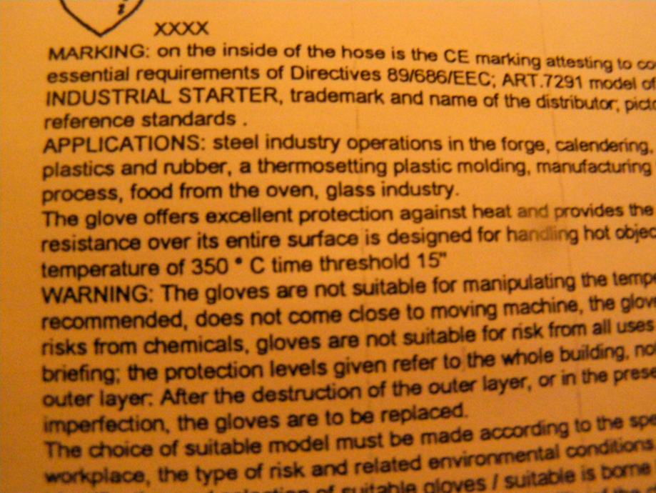 Rukavavice su normi EN407: termički rizici, toplina i vatra i EN 388 mehanička zaštita.