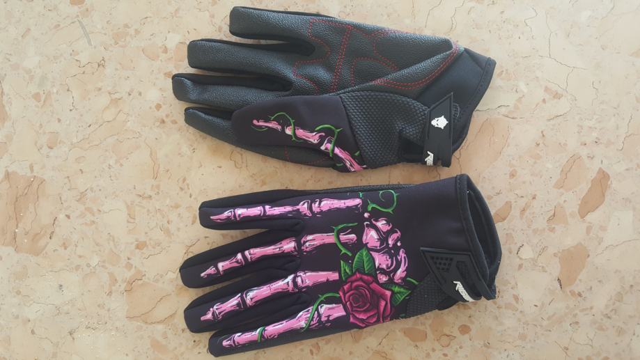 Unisex vodo i vjetronepropusne rukavice veličine M izrađene od kombinacije materijala vuna,najelon,koža u crnoj boji sa efektnim ružičastim detaljom ruže.