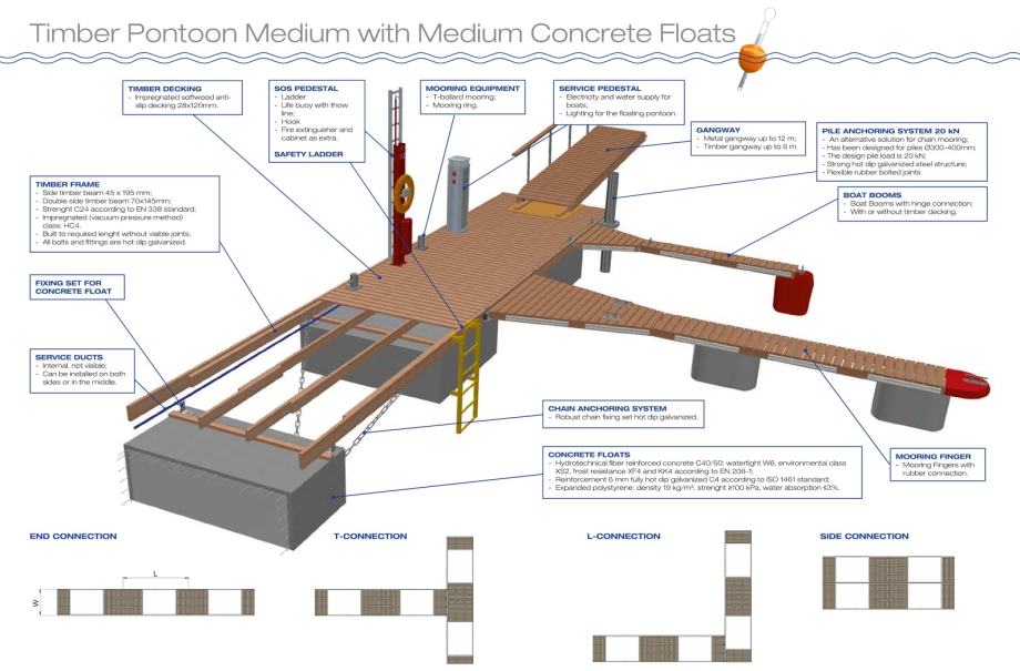 Proizvodimo drvene pontone s betonskim plovcima u tri standardne širine: 2,4 m, 3 m i 3,2 m. Visina nadvođa je 0,5–0,7 m, a duljinu gradimo prema vašim potrebama. Betonske plovke punjene EPS pjenom biramo prema željenoj nosivosti.