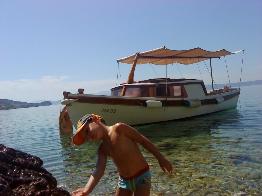 Drveni brod s kabinom, materijal murva, arež, hrast i mahagoni, dva ležaja, unutarnji motor yanmar 15ks, platnena tenda.