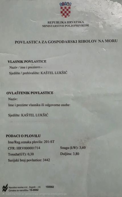 Prodajem ribarsku povlasticu, idealnu za brzo pokretanje vlastitog posla u morskom gospodarskom ribolovu.