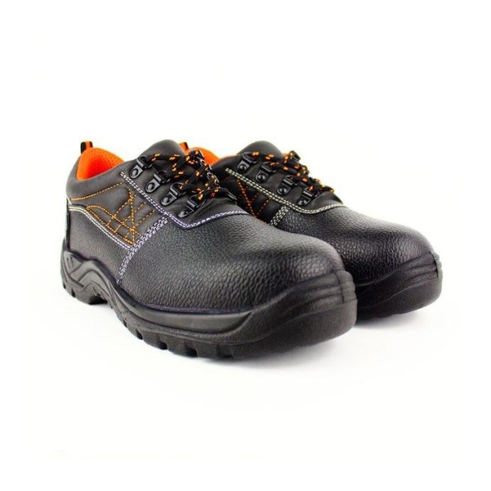 Opis: Niske radne cipele u crnoj koži sa postavljenim jezikom za bolju udobnost i zaštitu