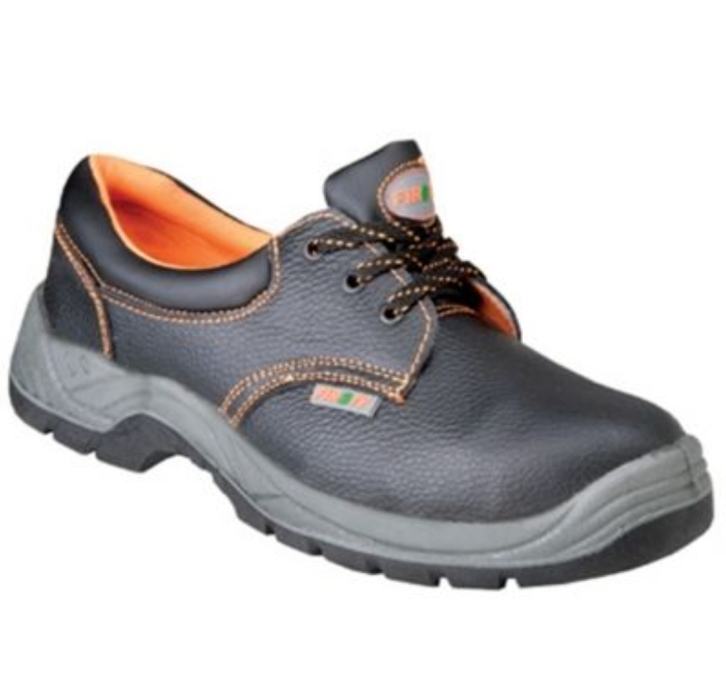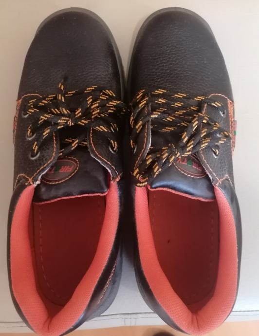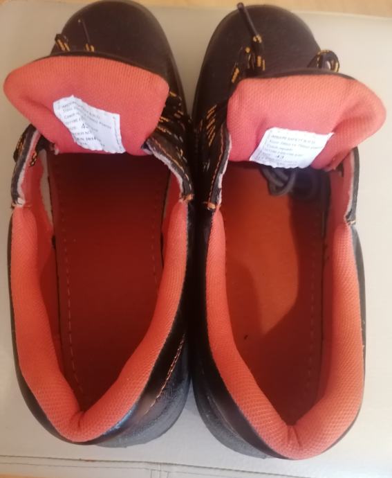 Niske zaštitne vodonepropusne cipele od crne glatke kože. prošivene narančastim tvrdim koncem.