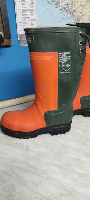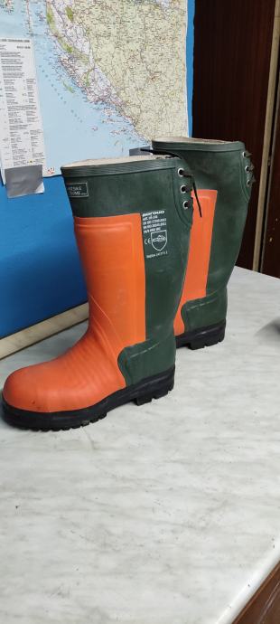Nove i ne korištene sjekačke čizme sa željeznom kapicom na prstima i dodatnom zaštitom za potkoljenicu. Br. čizme je 40. ,proizvodnja Borovo ,art. Hš-246.