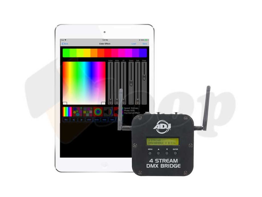 4 STREAM DMX Bridge je kompaktni bežični uređaj koji nesmetano povezuje 4 DMX uređaja s WiFi, Art-Net, SACN i WiFLY signalima za bežično upravljanje kompatibilnim DMX uređajima uz aplikaciju za iOS uređaje. 4 STREAM DMX BRIDGE stvara privatnu samostalnu WiFi mrežu na 2,4 GHz DSSS (Direct Sequence Spread Spectrum), koja zajedno s drugim bežičnim tehnologijama postoji u RF okruženjima. Nije potrebna postojeća mrežna infrastruktura ili povezivanje s vanjskom mrežom. 4 STREAM DMX BRIDGE je idealan za manje produkcije, noćne klubove, barove ili bilo koje mjesto koje zahtijeva kvalitetno i robusno rješenje za upravljanje rasvjetom.