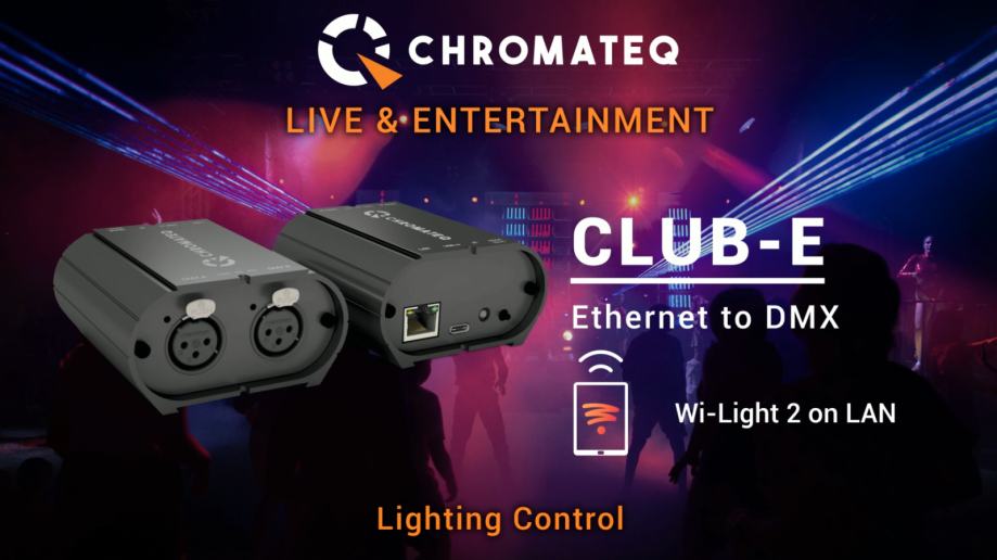 Idealan DMX controller za sve korisnike, iskusne stručnjake za rasvjetu i zahtjevne projekte, CLUB-E se ističe u kontroli nastupa uživo, sinkronizaciji audio i video vremenske trake, te preciznoj automatizaciji zvuka i svjetla, koristeći BESPLATAN softver Chromateq "PRO DMX 2", koji svako računalo pretvara u moćnu konzolu za upravljanje rasvjetom. S dobrim kapacitetom interne memorije, također možete koristiti CLUB-E u samostalnoj (standalone) aplikaciji i koristiti ga s mobilnim BESPLATNIM softverom "Wi-Light 2" kada je spojen na WIFI.