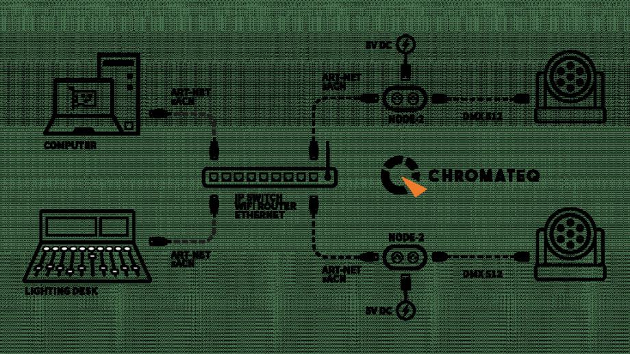 NODE-2 je kompatibilan s bilo kojim standardnim izvorom podataka iz industrije profesionalne rasvjete kao što su Art-Net ili sACN s računala i DMX stola. NODE-2 pretvara i dekodira sve Art-Net i sACN signale u DMX 512 signal na 2 DMX linije. Podržava Unicast, emitiranje, fiksni IP i DHCP konfiguraciju na UDP-u i može se konfigurirati pomoću našeg DEVICETOOL-a ili web preglednika (vrlo brzo).