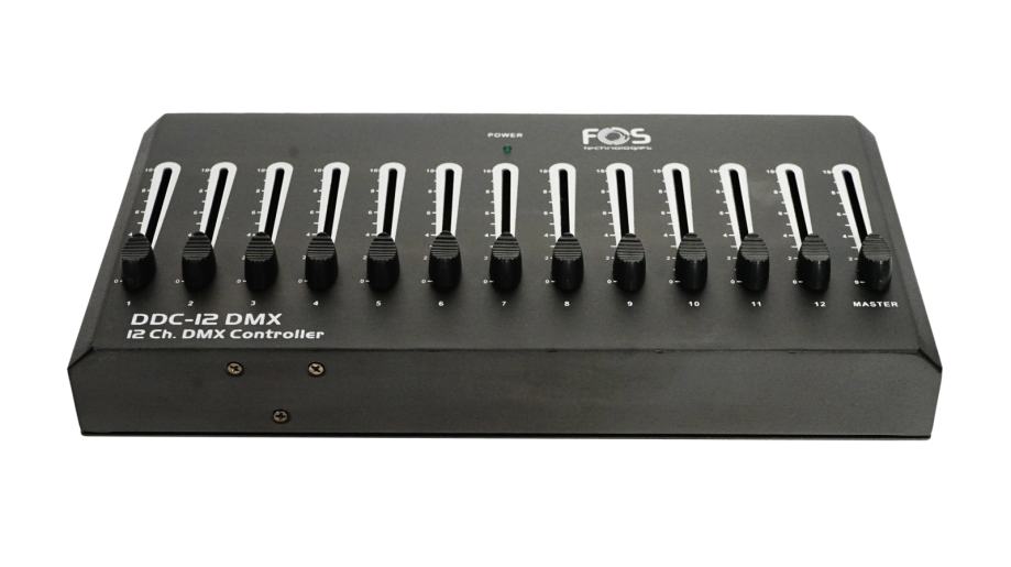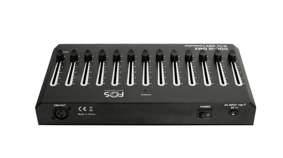 12 Channels DMX Controller, 12 individual channel faders one master fader. 12 DMX channels. Compact design simple operation, DMX Output: 3 pin female XLR DMX connector.