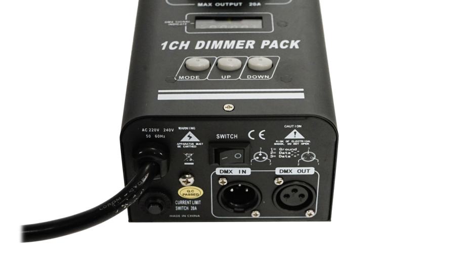 1 channel DMX Dimmer, 10A channel output, LCD display 3 pin male XLR socket for DMX input. Two control curves are available: SWITCH,LINER, dimming from 0-100%.