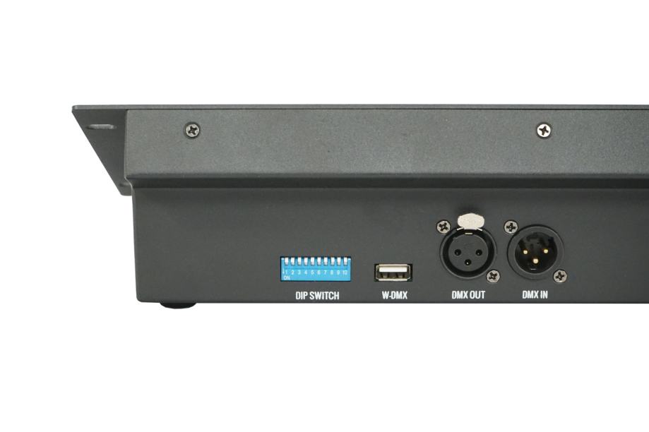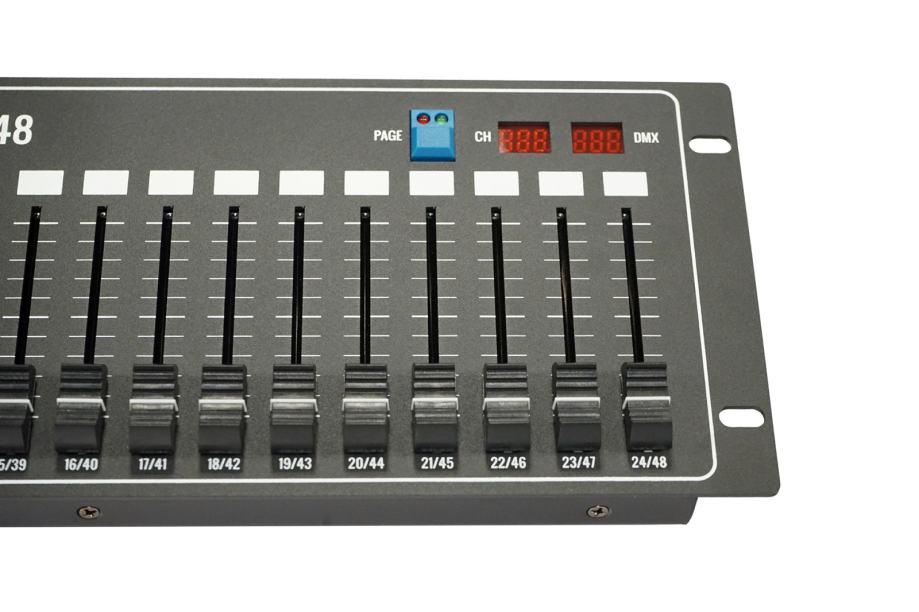 48 Channel control console, with 24x faders, on two pages. The console is addressable and can send DMX signal from 1 to 512 channels (in groups of 48 channels). It offers a channel and DMX value indication LED screens. Suitable for dimmer control, or testing purposes.