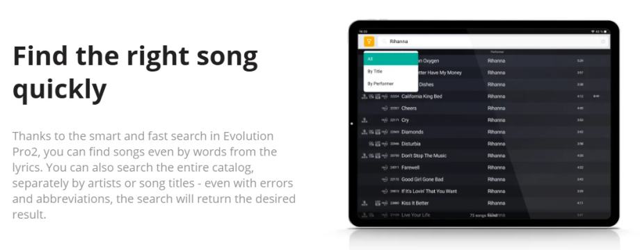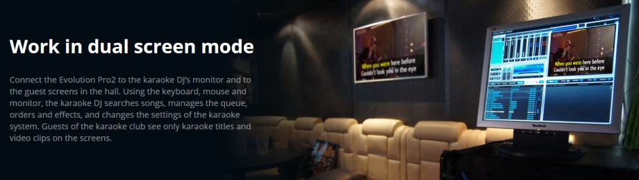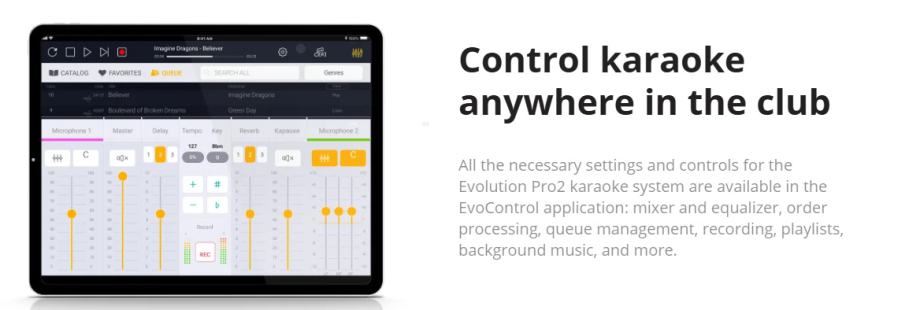 Karaoke Evolution Pro2 je profesionalni karaoke sustav dizajniran za karaoke klubove i ozbiljne entuzijaste. Opremljen je naprednim značajkama koje omogućuju potpunu kontrolu nad glazbom, redoslijedom pjesama, efektima i ocjenjivanjem nastupa. DJ može upravljati sustavom putem posebne aplikacije, dok gosti vide samo karaoke video na ekranima.
