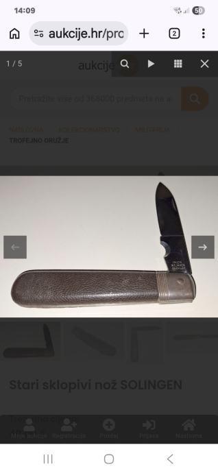 Prodajem stari sklopivi nož Solingen. Radi se o klasičnom džepnom nožu s tamnom oštricom i kožnom koricama smeđe boje. Solingen je poznata njemačka oznaka kvalitete za noževe i sječiva, a ovaj primjerak nosi tu tradiciju.