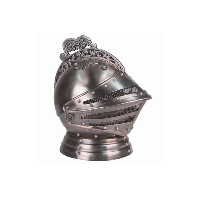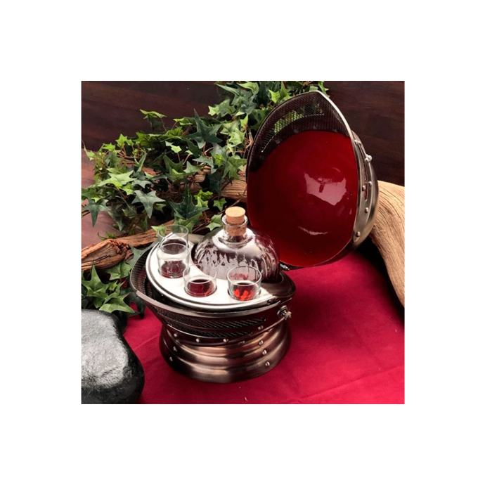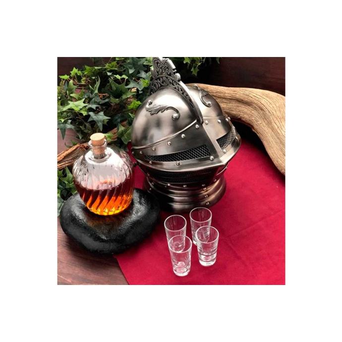 Vaš će dom oživjeti dodavanjem ovog čudesnog barskog seta. Temeljena na jedinstvenom vintage dizajnu, koji nije dostupan od sredine 1960-ih, ova metalna kaciga može krasiti vaš šank, stol ili policu s knjigama. No, kad se vizir podigne, kaciga otkriva prekrasni stakleni vrč i četiri staklene čaše. Unutrašnjost je emajlirana crvenom bojom s držačem čaša i vrča u crvenoj boji.