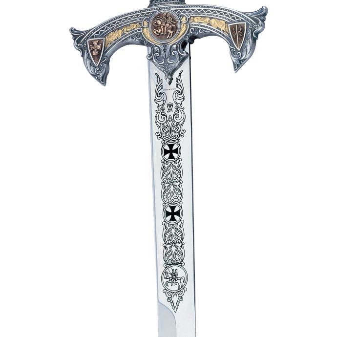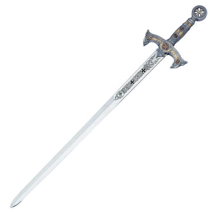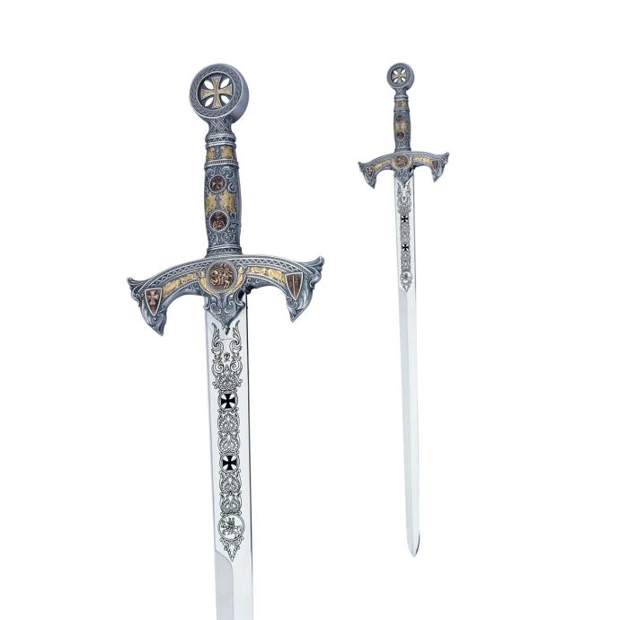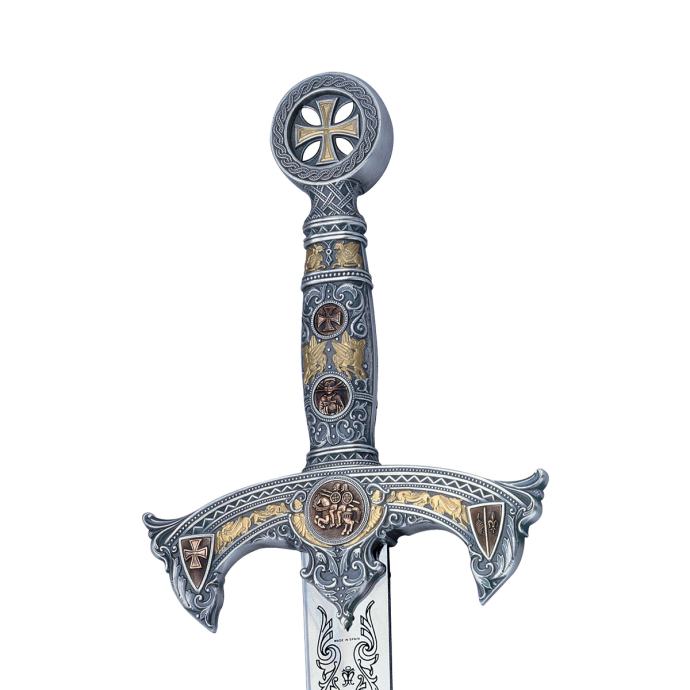 Prekrasan templarski mač izrađen od kaljenog nehrđajućeg čelika s posrebrenim završetkom i ručno ugraviranom drškom s templarskim znamenjem.