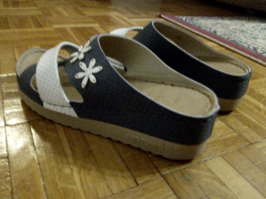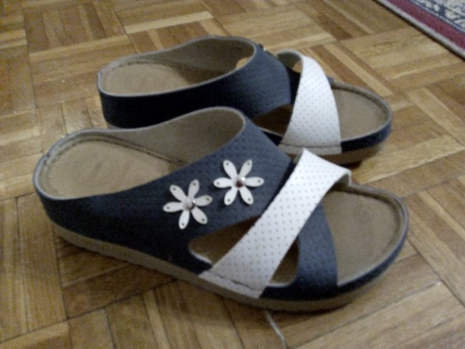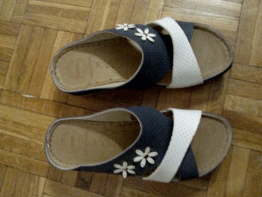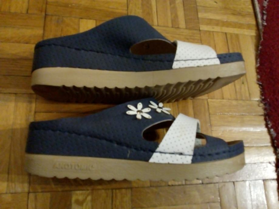 Povoljno prodajem anatomske vrlo udobne papuče bež-bijelo-plave boje.