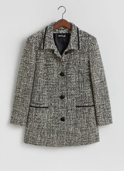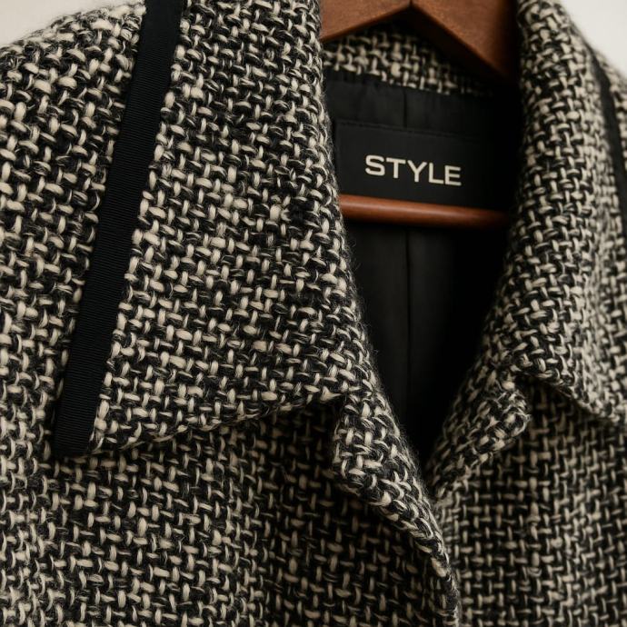 Elegantna ženska jakna od crno-bijelog tvida, klasičnog kroja i bezvremenskog dizajna.