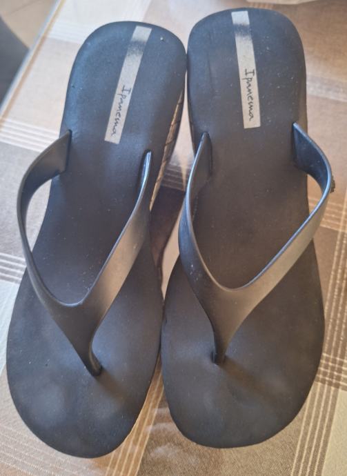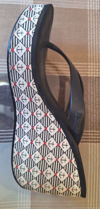 Prodajem Ipanema crne ženske japanke na punu petu (uzorak sa sidrima, visina pete 7,5 cm), veličina 40. Japanke su vrlo malo nošene i u izvrsnom stanju.