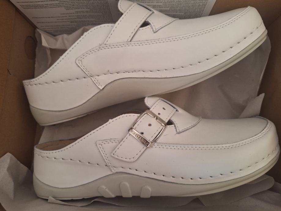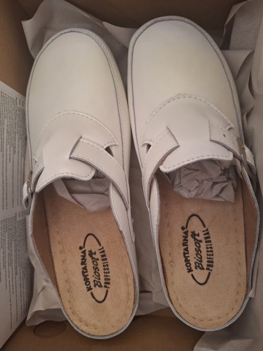 Bijele bio soft klompe br.39 ( Kopitarna).Materijal- koža. Dno ima neklizajuću podlogu. Novo s kutijom.