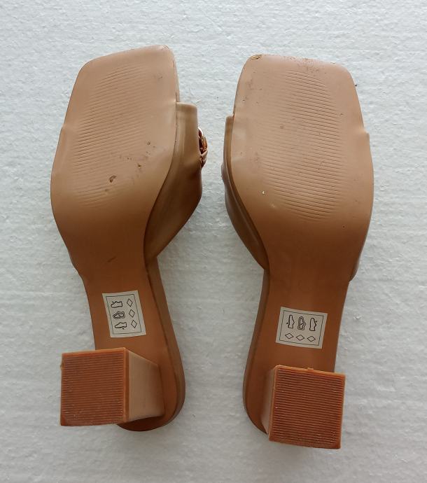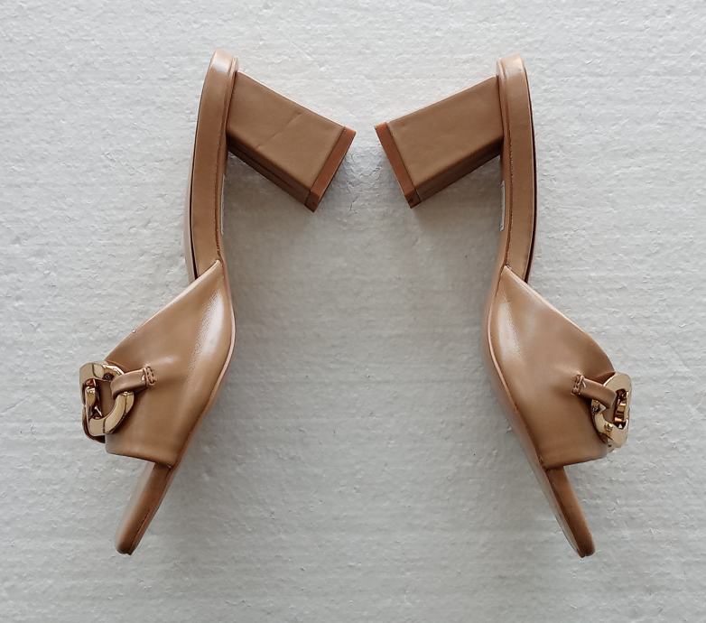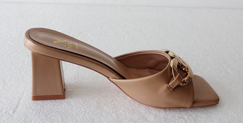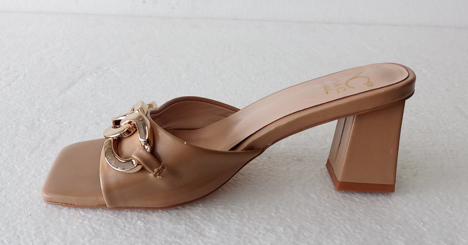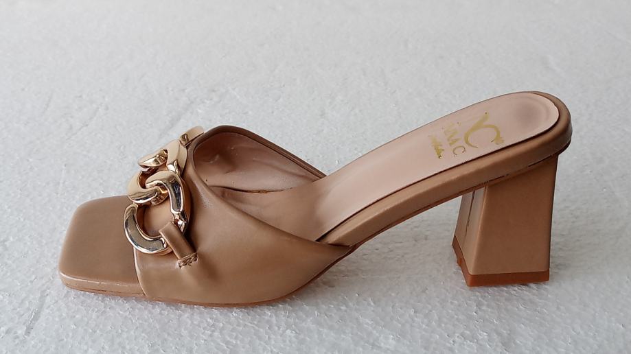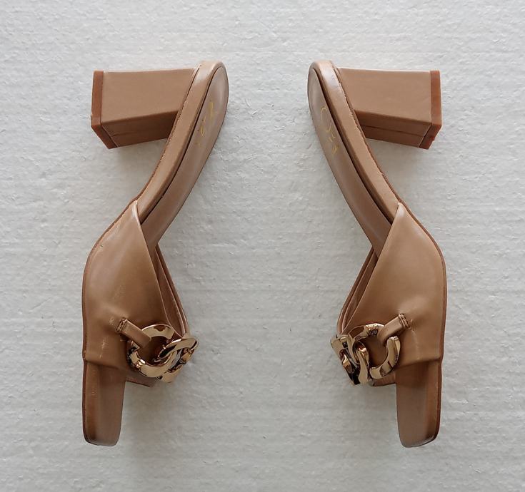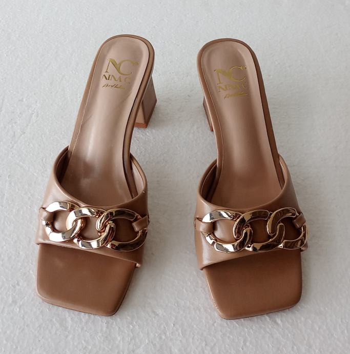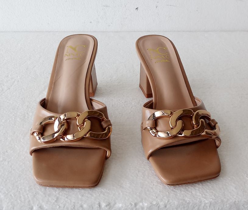 Nina C natikače sa ukrasom od širokog zlatnog lanca, veličine 38 (unutrašnje gazište 25 cm). Izrađene od imitacije glatke kože. Široka petica visine 6,5 cm.