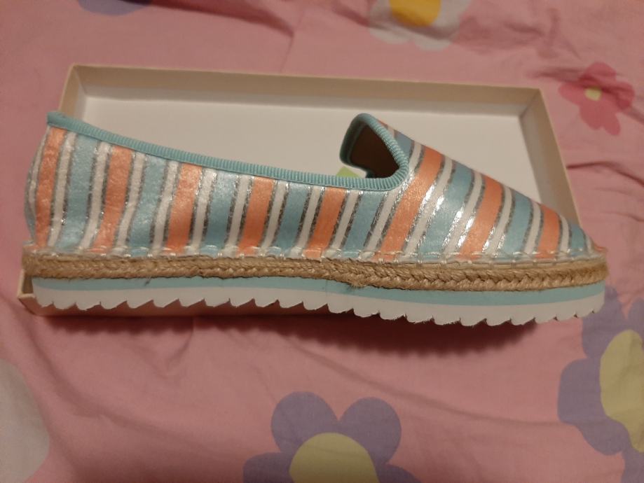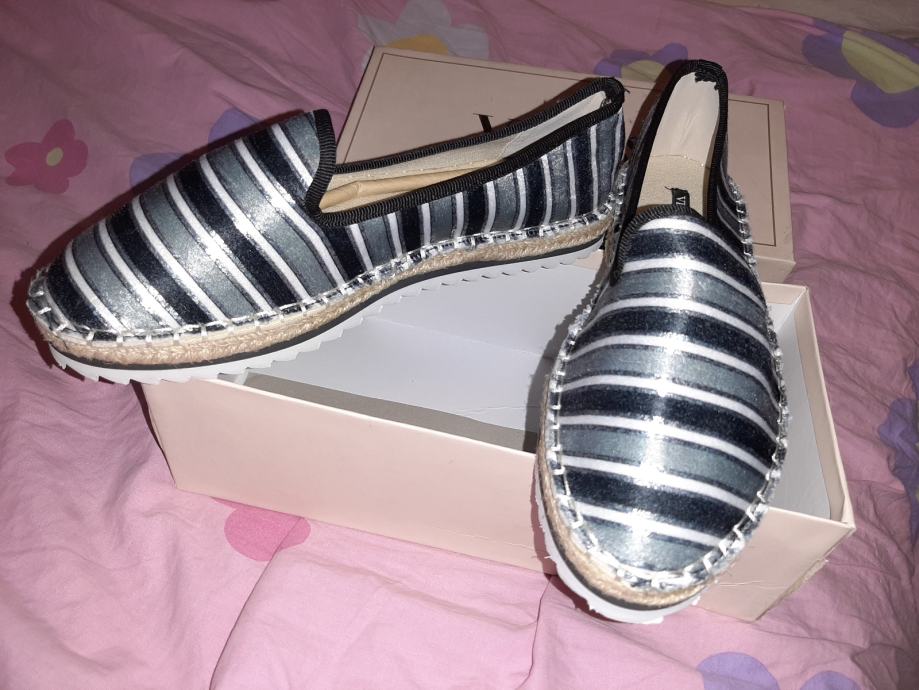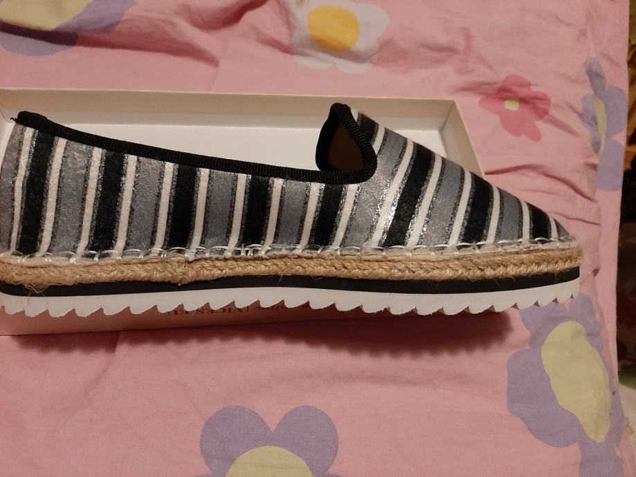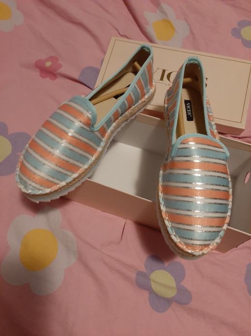 2 para novih ženskih, pamučnih, prugastih espadrila, crno sivo bijele, svjetlo plavo roza sa srebrnim crtama, veličina 39, 10 eura 1 par
