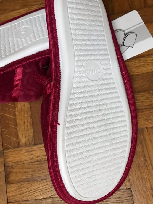 Nove crvene unisex papuče veličine 40, izrađene od gume s mekanim mučastim unutarnjim dijelom. Ukrašene su elegantnom mašnicom i imaju uzorak pletenice, idealne za ugodnost u domu.