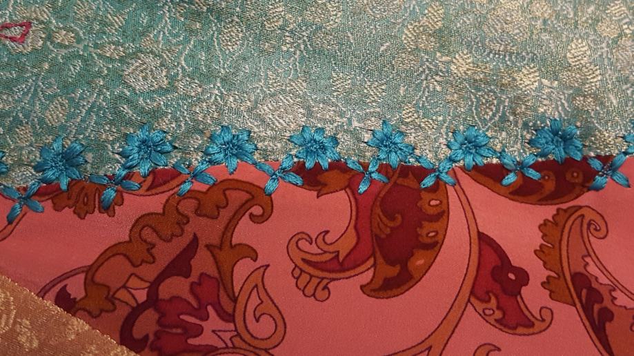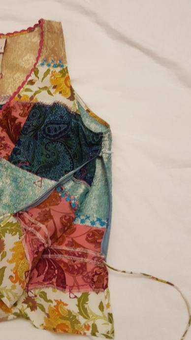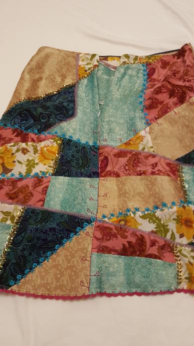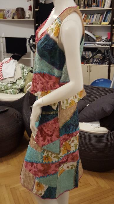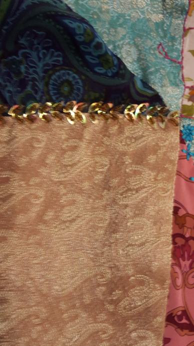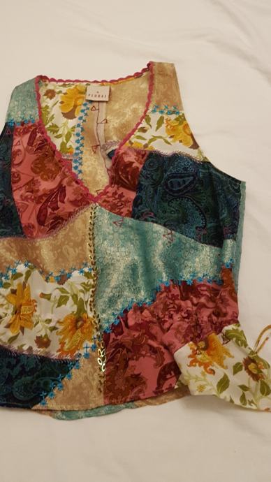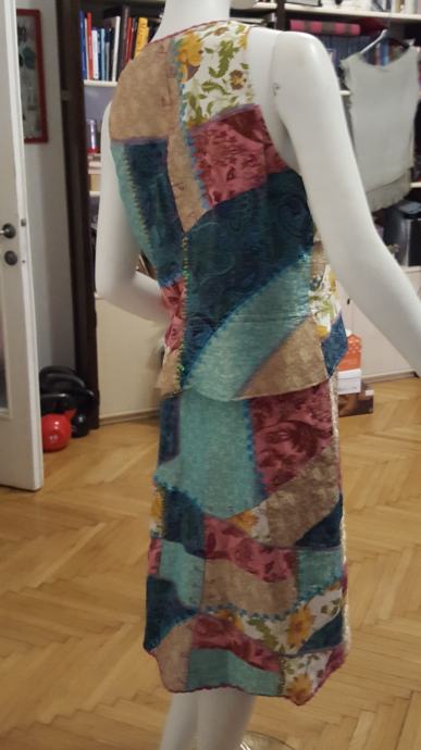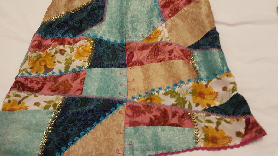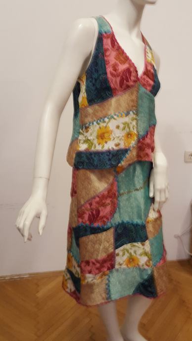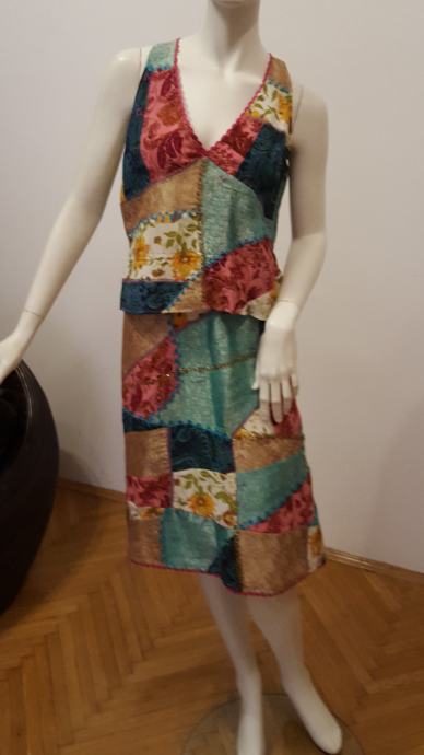 Vrlo lijepi ženski komplet - suknja i majica - od svile i brokata s podosta izvezenih ukrasnih dijelova, pa i našivenih perlica. Majica ima s lijeve strane patentni zatvarač, a u struku je provučena tanka pasica koja se može stisnuti pa se pri dnu majice dobije efekt volana. Suknja ima patent sa stražnje strane. Prema dole se lagano širi. Veličina kompleta je 48 (talijanski), mada realno odgovara i manjim brojevima tj može ga nositi netko veličine L i M. Suknja: širina struka 40, duljina 58. Majica: širina u prsima 48, duljina 54. Komplet je kupljen u Spanjolskoj i španjolske je proizvodnje (PLURAL/Shakira). Plaćen je u trgovini 100€. Nije nošen niti jednom, u odličnom je stanju. Etikete nema. Cijena 55€ s uključenom dostavom.