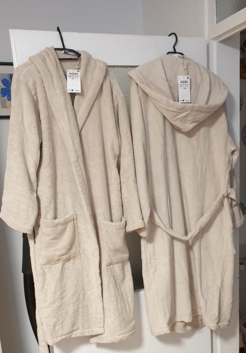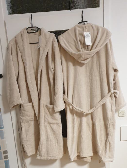 Prodajem dva kupaonska uniseks ogrtača ZARAHOME boje pijeska, 100 % pamuk, s kapuljačom, s pojasom za vezanje oko struka i bočnim džepovima, veličine S/M i L/XL, novi, neoprani, nenošeni. Cijena 40,00 € po komadu (u trgovini je 69,99 €).