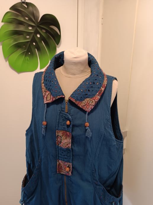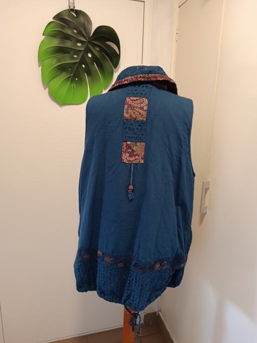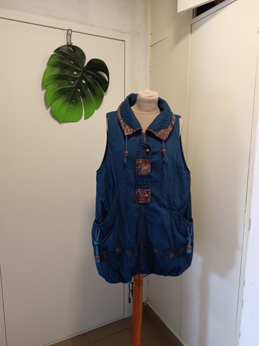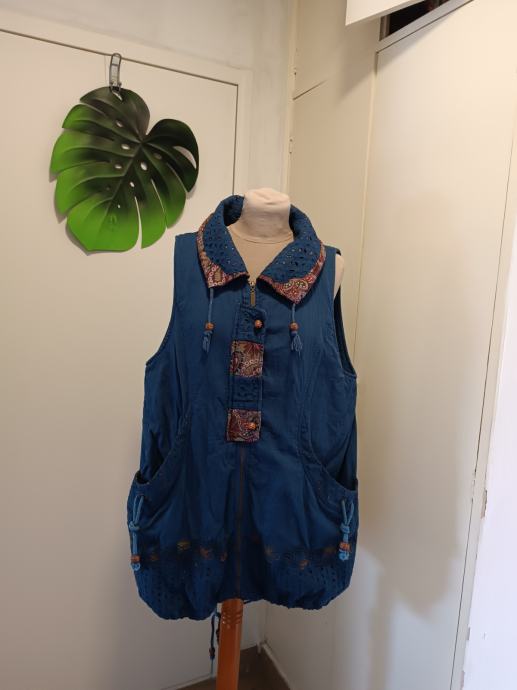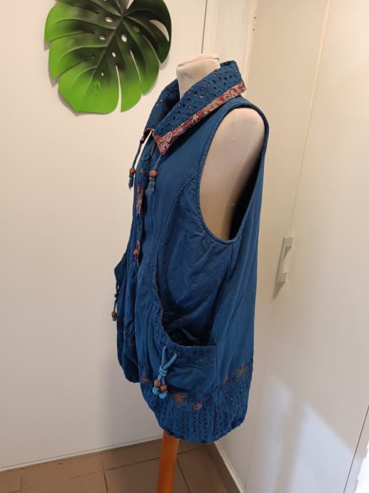 Predivan pamučni prsluk s brojnim detaljima. Izvezen, moderan. Dva velika i duboka džepa. Kopča se patentom cijelom duljinom. Može se nositi iznad veste.